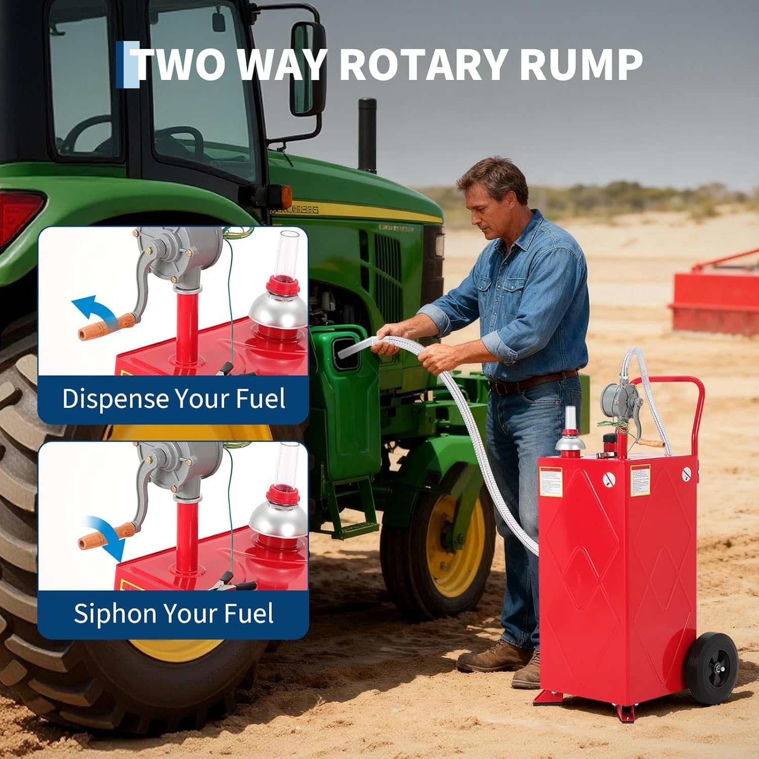 Keep your fuel safe and easy to transport with this 30-gallon fuel caddy, designed for gasoline, diesel, or kerosene. Whether you need fuel for cars, ATVs, lawn mowers, boats, or outdoor equipment, this portable tank provides a reliable solution for on-site refueling and storage.The caddy features a two-way rotary hand pump with a 9.8ft kink-free hose, making it simple to dispense or siphon fuel without extra equipment. The large fuel gauge allows you to monitor levels at a glance, while the wide neck and secure cap help reduce spills during filling.Transporting fuel is easier thanks to the 10" all-terrain wheels and molded handle, allowing smooth movement over grass, gravel, or uneven surfaces. Its low center of gravity helps maintain balance, reducing effort when moving the caddy across different terrains.Constructed from durable carbon steel, this fuel caddy is resistant to dents, weather changes, and UV exposure. It is designed to provide long-lasting performance in outdoor environments, making it suitable for farms, workshops, construction sites, or home use.Compact and versatile, this fuel caddy fits in truck beds, garages, or storage sheds, giving you convenient access to fuel whenever needed. Perfect for a variety of vehicles and equipment, it combines portability, durability, and safe handling in one practical design.