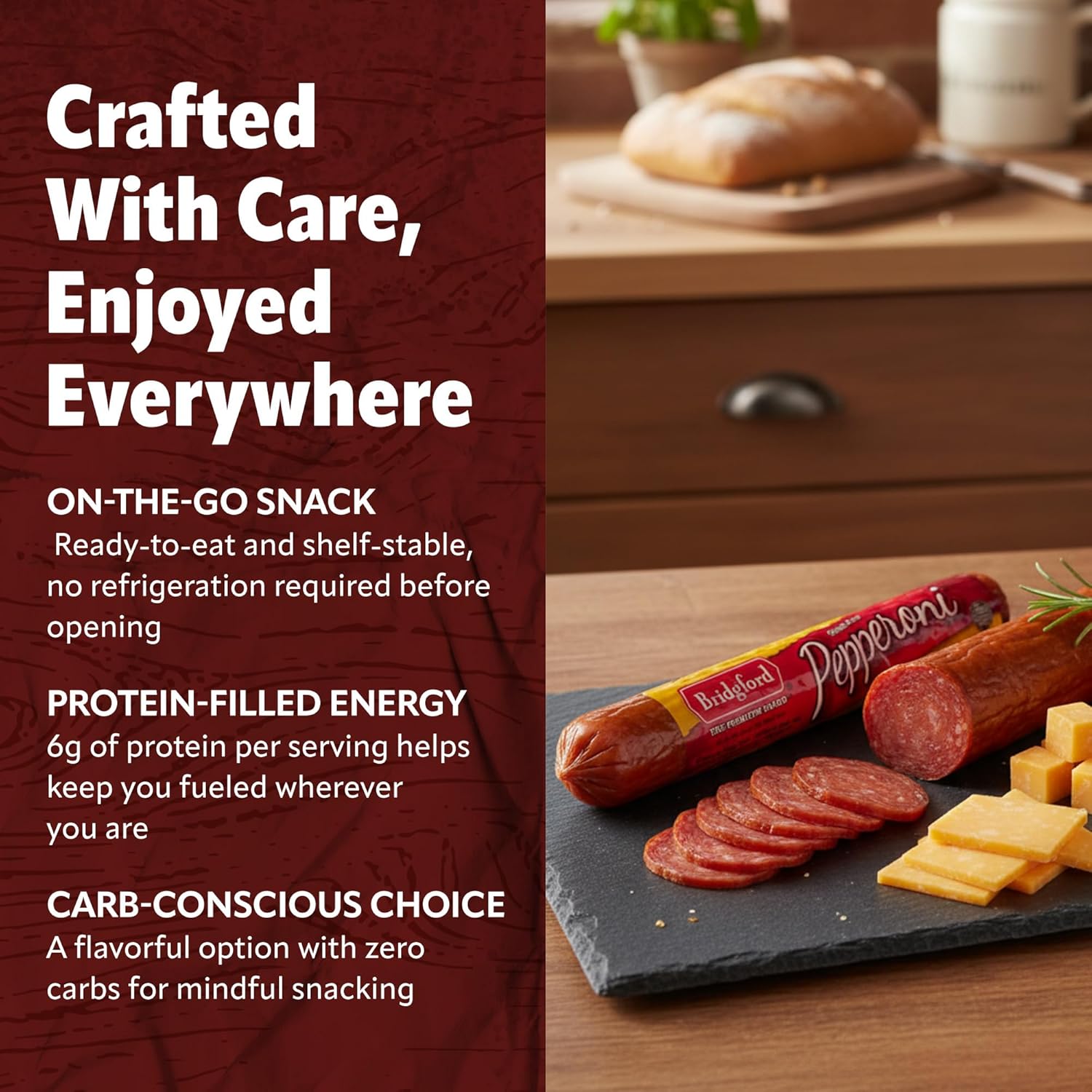 Crafted with time-honored care, this pepperoni stick delivers bold, authentic flavor perfect for pizza, sandwiches, or a charcuterie board. Each 7 oz stick is naturally smoked, aged, and made from select cuts of pork and beef for rich, savory taste. With zero carb and high protein content, it’s an excellent low carb, keto-friendly snack for those who enjoy satisfying, high protein snacks. Slice it thin as sandwich meat, pair with cheese on a charcuterie platter, or enjoy as a ready-to-eat snack anytime. Each pack includes six sticks, individually sealed for freshness. Dimensions: 11 × 4.5 × 1.75 in. Portable, shelf-stable, and full of flavor, this pepperoni is ideal for travel, picnics, and everyday snacking. Experience the taste of authentic aged meat in every bite.