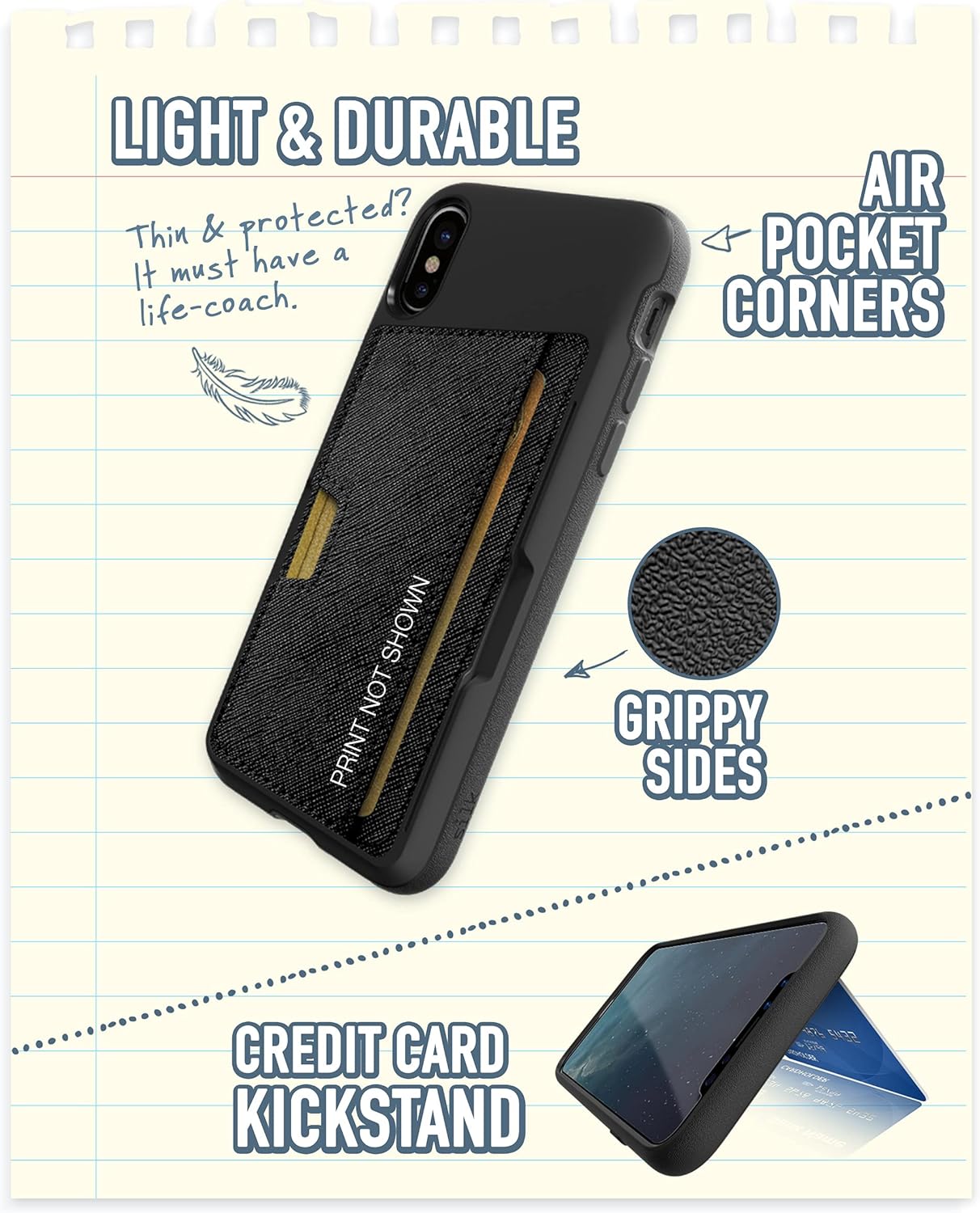 | Additional Features | Air-Pocket Corners, Card Slot, Kickstand, Lightweight and Protective, Screen & Camera Protection |