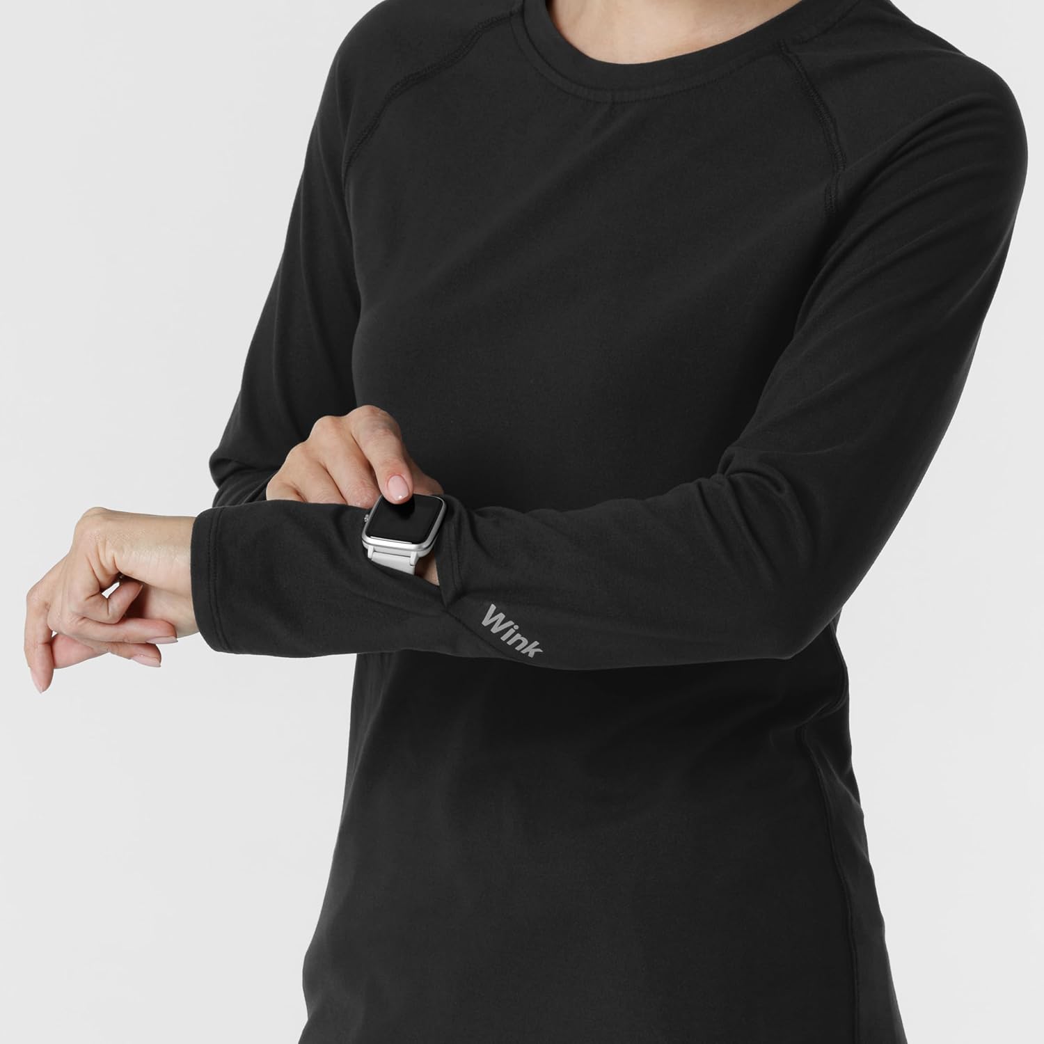 Keep track of time, steps, and notifications without missing a beat with this innovative women's scrub top. Designed with a smart watch opening on both sleeves, it lets you easily check your watch during your shift without interrupting your flow. Whether you wear your watch on the left or right, this top has you covered. Made from super soft fabric, it’s comfortable enough for all-day wear, whether layered over a short-sleeve scrub top or on its own. The raglan sleeves provide extra give at the elbows, allowing for unrestricted movement and flexibility. The crewneck design adds a polished, professional touch to your look, while the reflective Wink logo adds a subtle reminder of the amazing work you do every day.